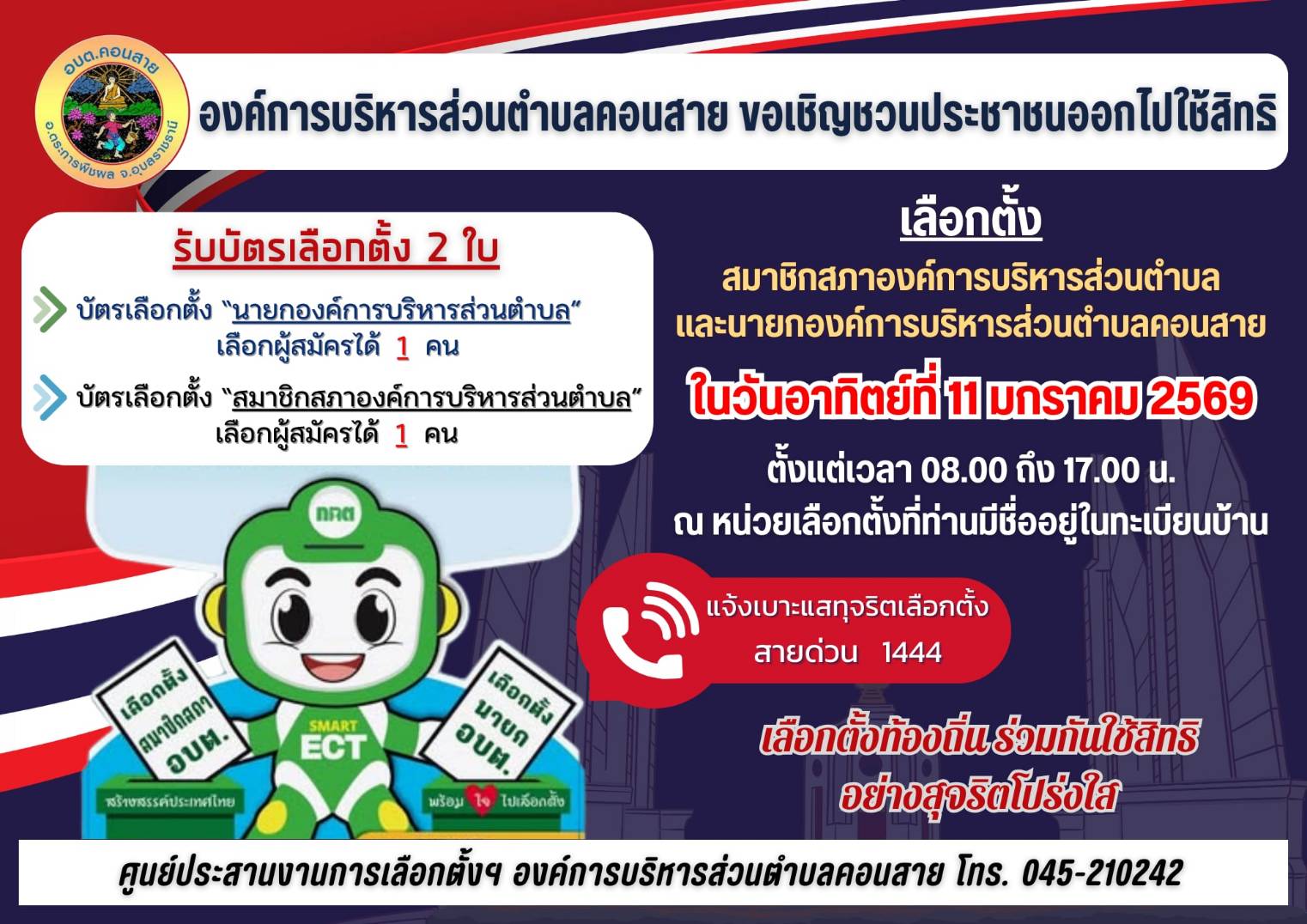 องค์การบริหารส่วนตำบลคอนสาย ขอเชิญชวนประชาชนไปใช้สิทธิ์เลือกตั้ง - นายกองค์การบริหารส่วนตำบล - สมาชิกสภาองค์การบริหารส่วนตำบล ตั้งเเต่เวลา 08.00 น. ถึง 17.00 น. ณ หน่วยเลือกตั้งที่ท่านมีชื่ออยู่ในทะเบียนบ้าน #อบตคอนสาย ? ติดตามข่าวสารจาก อบต.คอนสาย